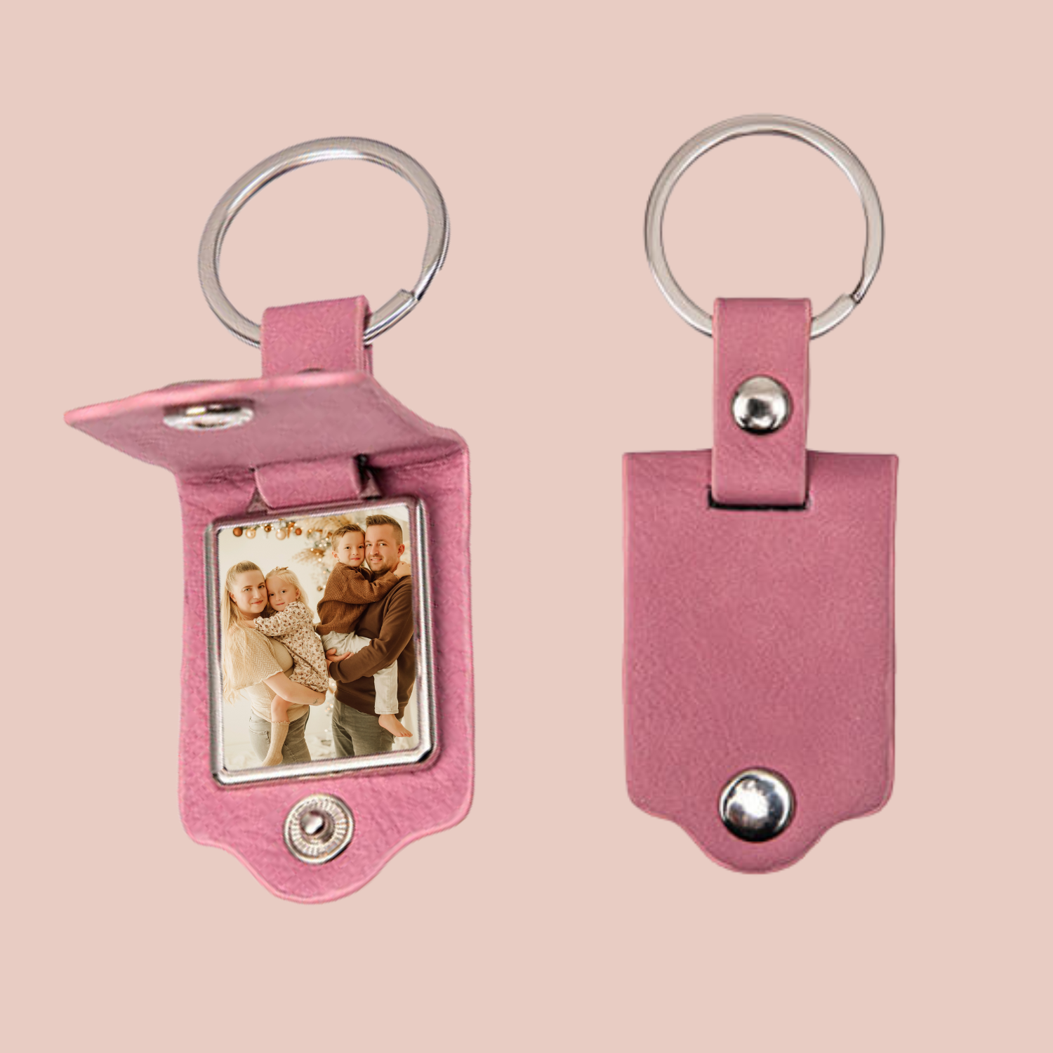 Maak je sleutels persoonlijk met deze stijlvolle sleutelhanger van metaal en kunstleer. De rechthoekige vorm geeft een moderne uitstraling, terwijl je eigen foto het een unieke en persoonlijke touch geeft.